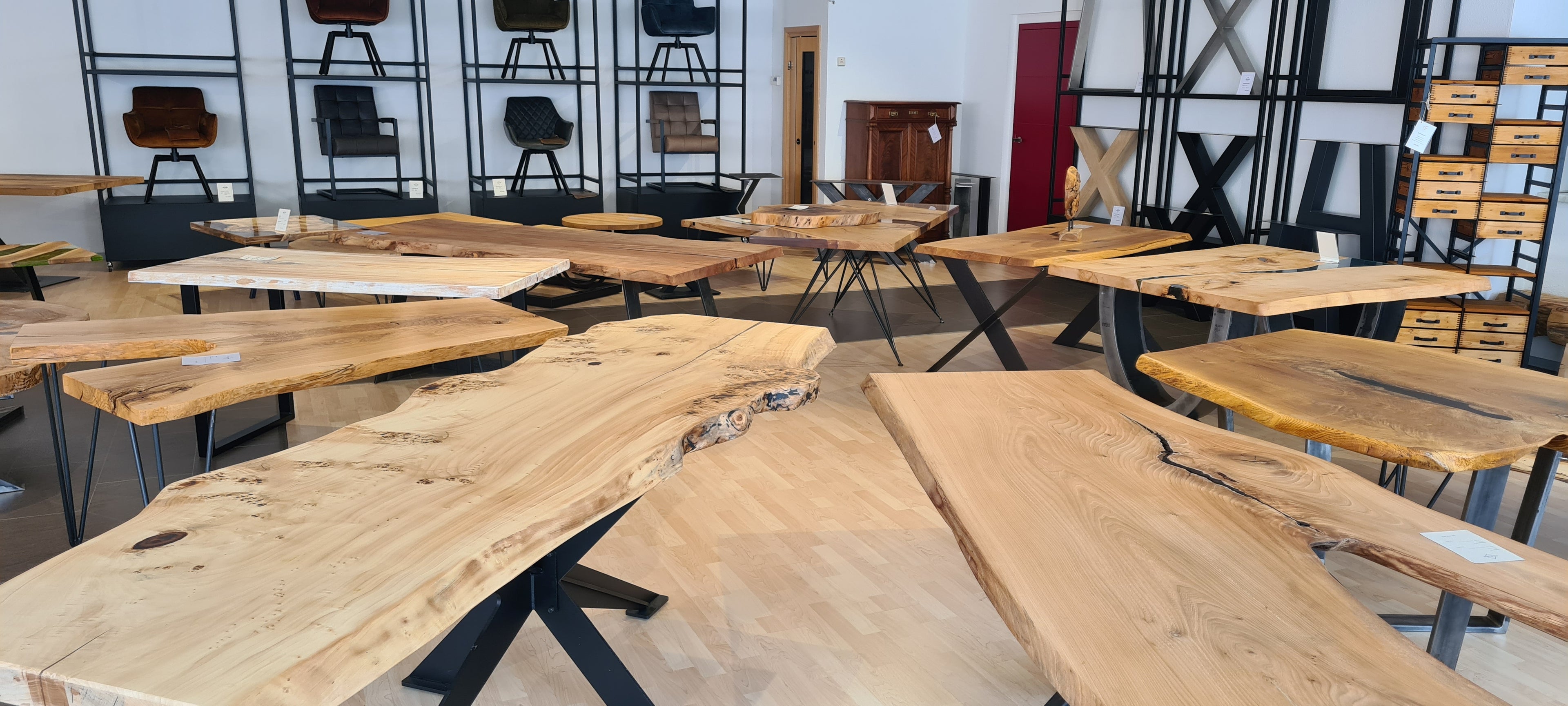 In unserer Ausstellung kannst du dich inspirieren lassen und deinen persönlichen Massivholztisch nach deinen Vorstellungen gestalten. Wir begleiten dich Schritt für Schritt – von der Auswahl der Tischplatte, Leimholz oder aus einem Stamm über Maße, Kantenarten und Oberflächenbehandlungen bis hin zu Epoxidharz-Veredelungen, Beizen und der Wahl des passenden Untergestells. Ergänzend bieten wir eine große Auswahl an passenden Stühlen, um dein individuelles Wohnkonzept abzurunden.