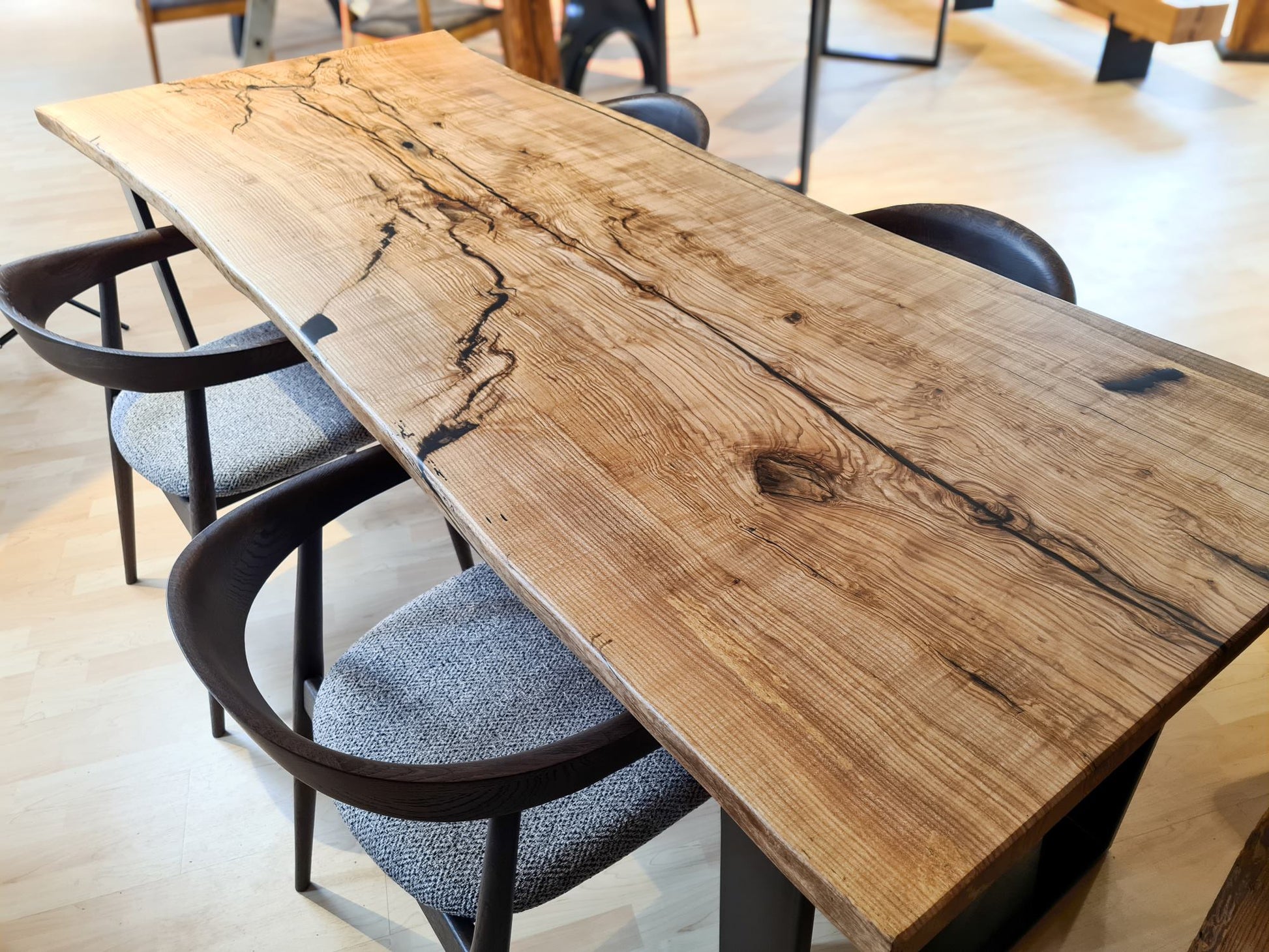 Der Esstisch aus rustikaler Esche kombiniert natürliche Ästhetik mit stabiler Verarbeitung.