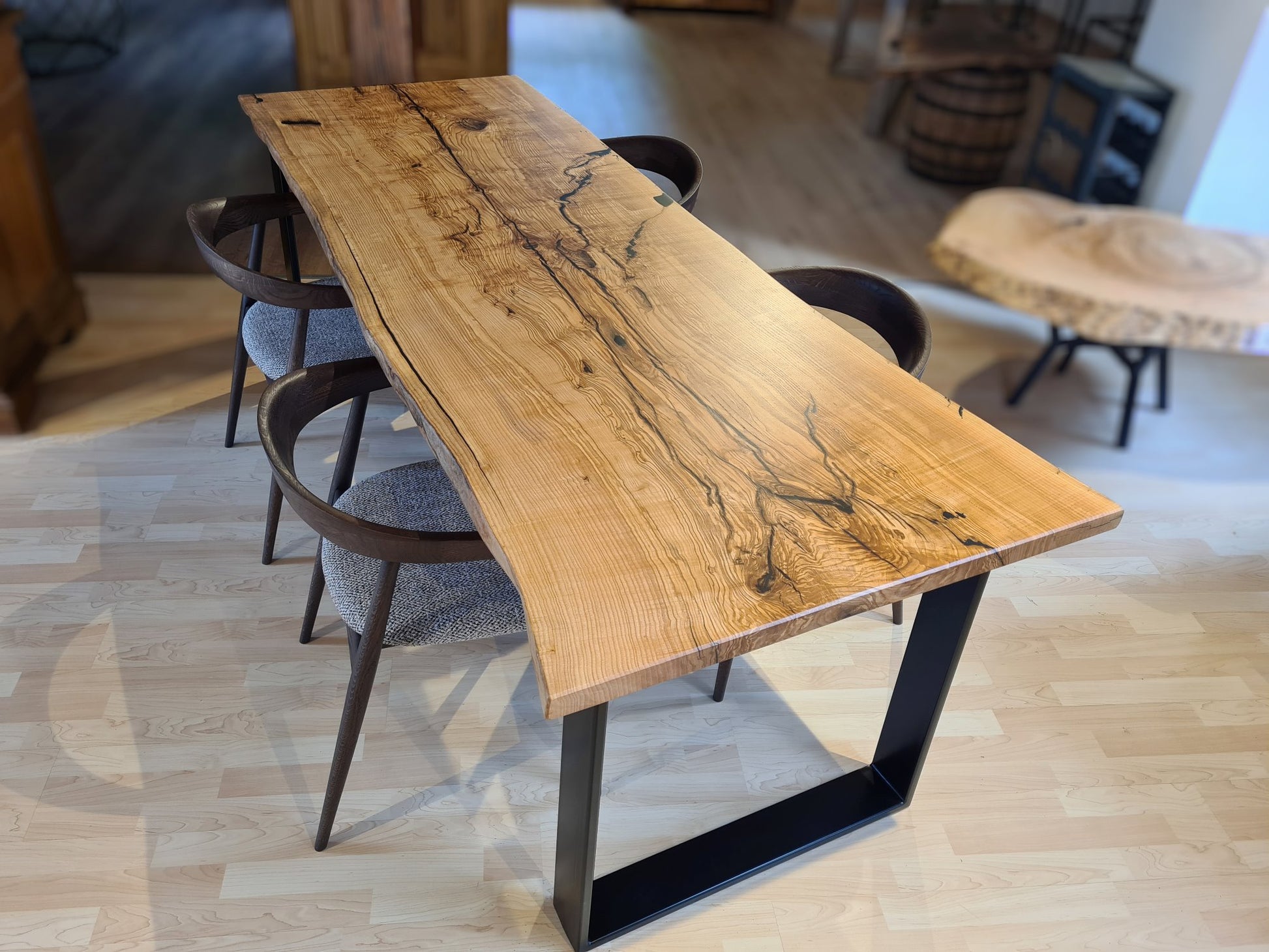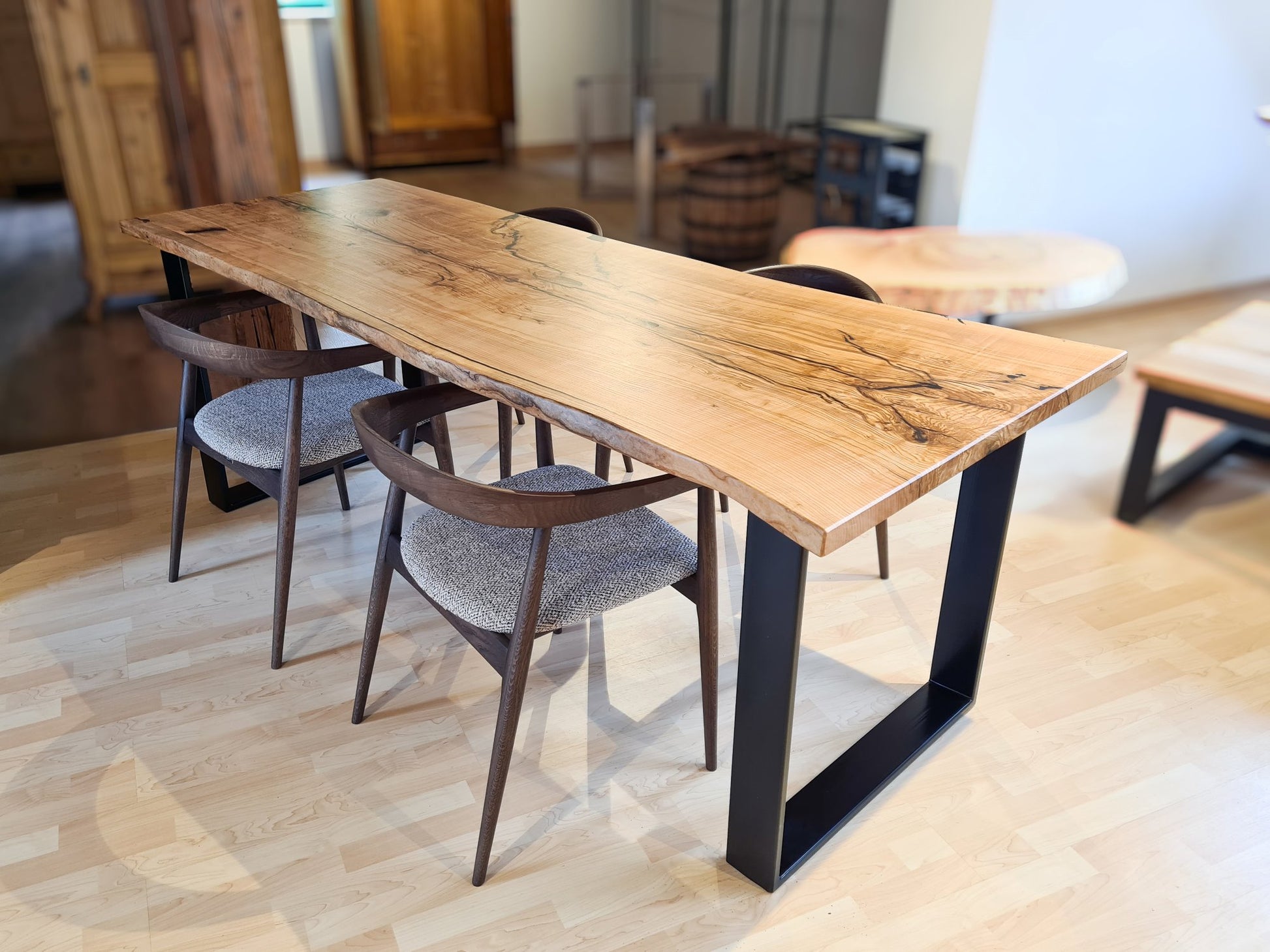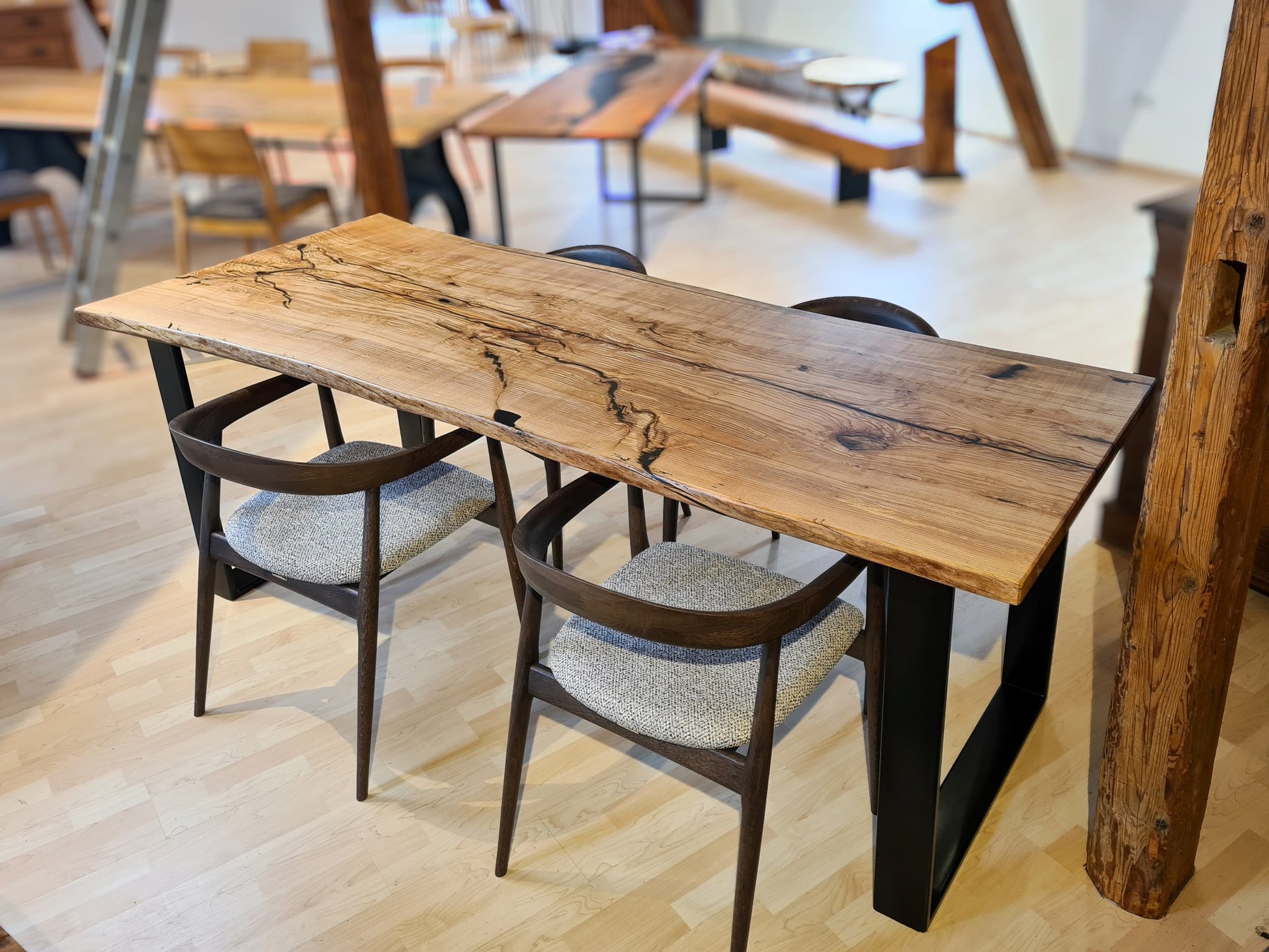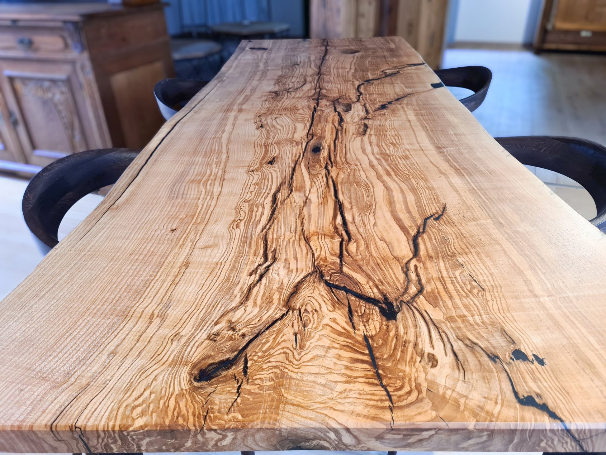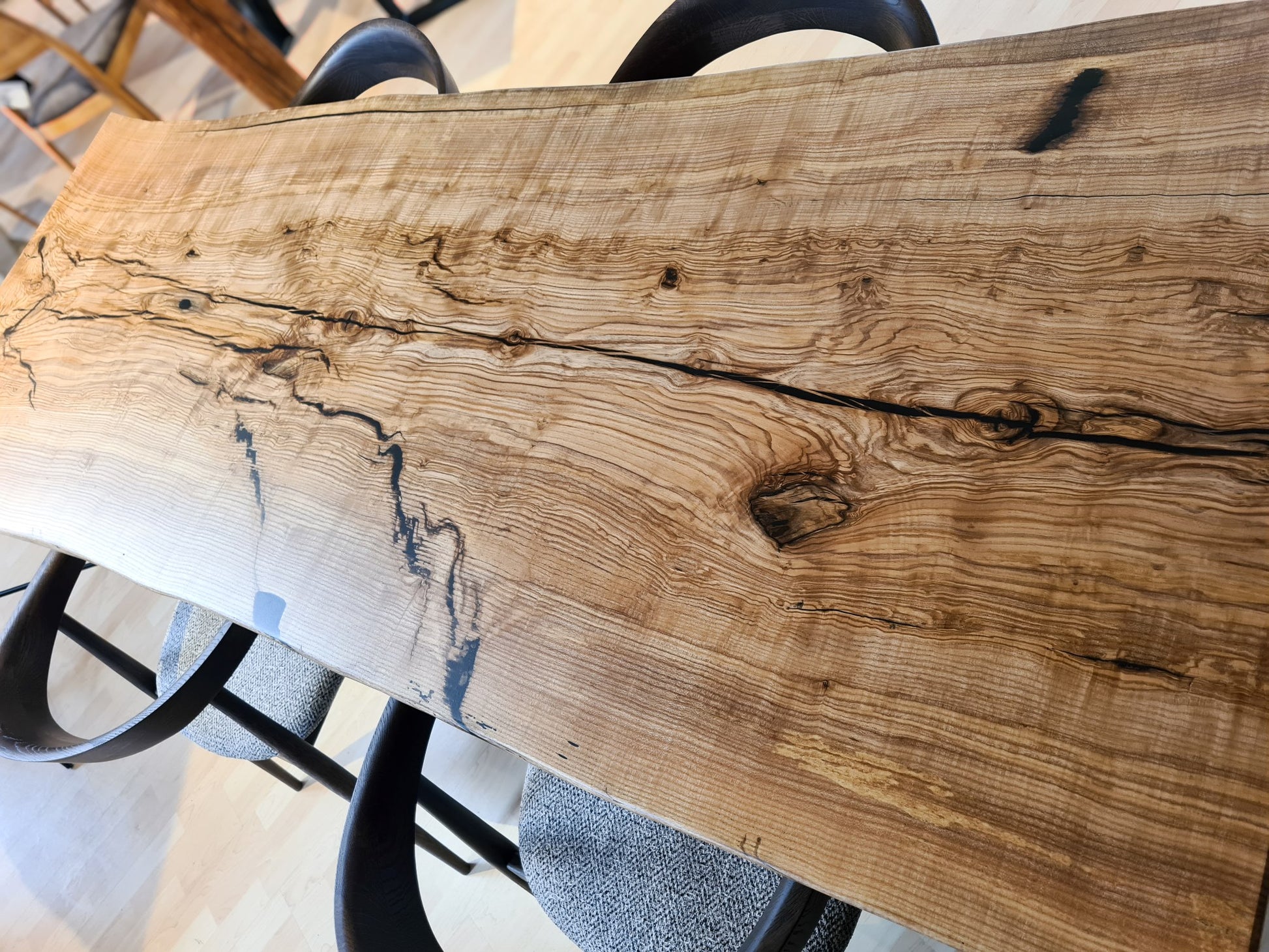 Finish: Fehlstellen schwarz geharzt, Baumkanten, geschliffen und versiegelt mit Dekor-wachs-öl